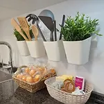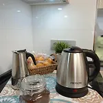 Naast koffie- en theevoorzieningen heeft dit appartement een complete keuken met een magnetron, een waterkoker en een koelkast.